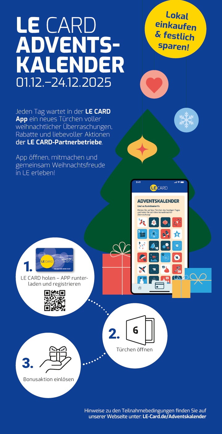 Die LE CARD erhalten Sie kostenfrei bei allen teilnehmenden Geschäften und Ausgabestellen. Eine Übersicht finden Sie hier. Einfach die LE CARD mitnehmen und gleich ab dem ersten Einkauf Shopping-Vorteile sichern. Über den QR-Code auf Ihrer LE CARD können Sie Ihr Guthaben jederzeit abrufen.